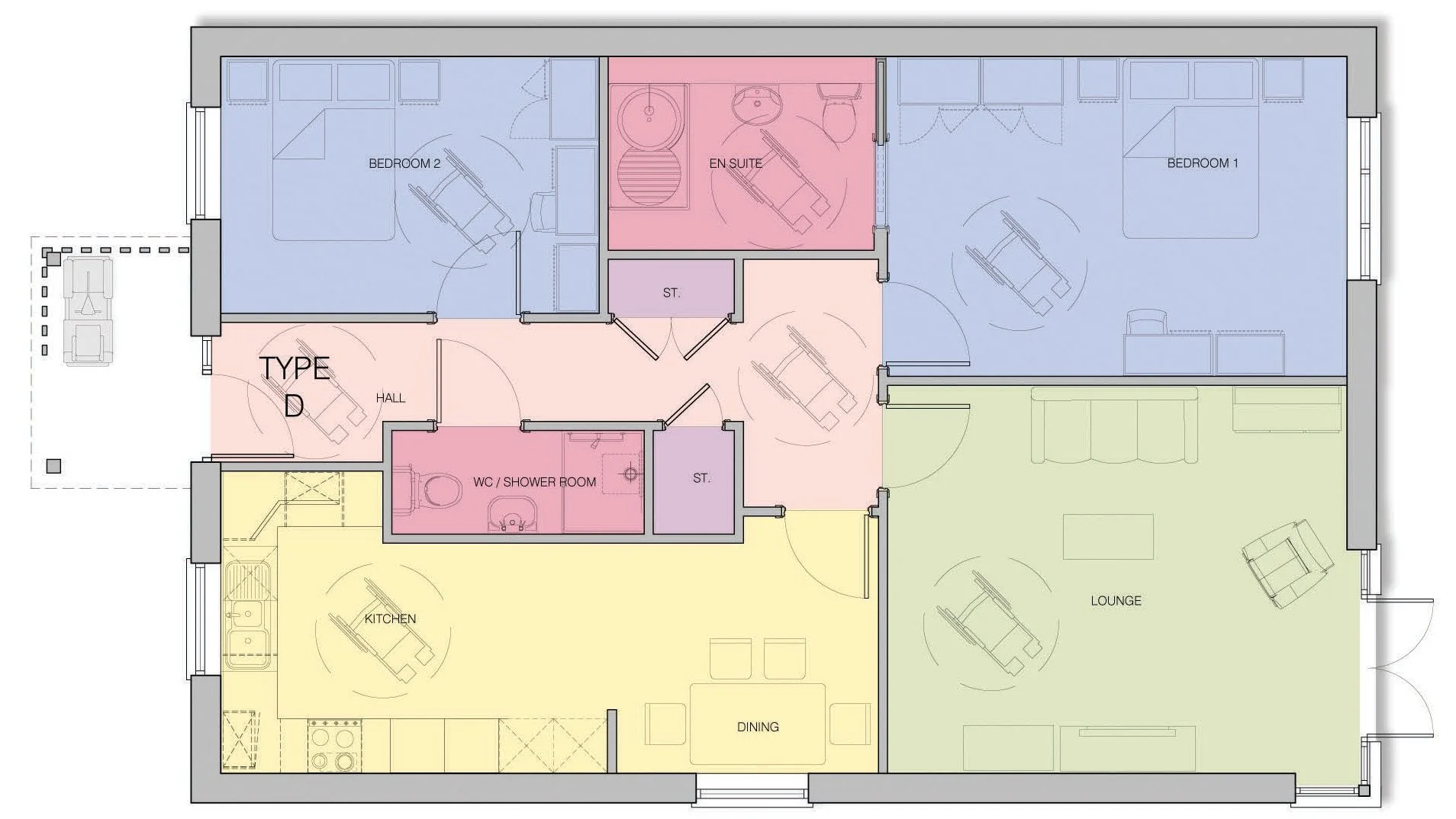 Accessible - homes will have assistive technology to give visibility and control to owners in terms of who enters their home. They have accessible building design for people with care needs e.g wheelchair/rollator friendly surfaces, lifts, contrasting colours for visually impaired, fully adapted wet rooms and kitchens, U drain installation for discrete waste handling.